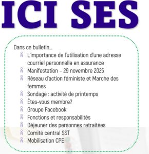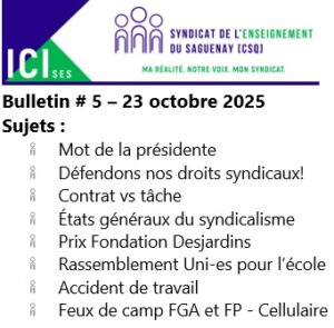 Dans le but de vous tenir informés des derniers développements lors de négociations ou encore de vous rappeler vos droits, le Syndicat de l’enseignement du Saguenay publie toutes les deux semaines un Bulletin ICI-SES. Si vous désirez avoir un article sur un sujet en particulier, n’hésitez pas à communiquer avec nous dans la section “nous joindre” du site.