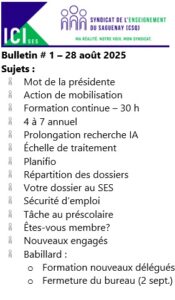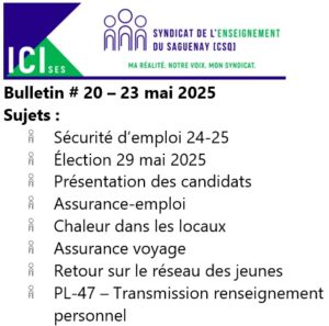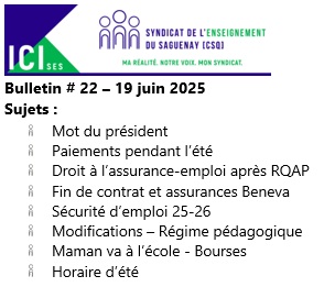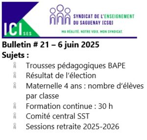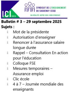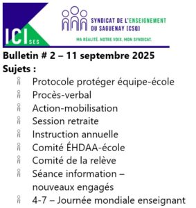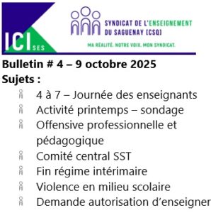 Dans le but de vous tenir informés des derniers développements lors de négociations ou encore de vous rappeler vos droits, le Syndicat de l’enseignement du Saguenay publie toutes les deux semaines un Bulletin ICI-SES. Si vous désirez avoir un article sur un sujet en particulier, n’hésitez pas à communiquer avec nous dans la section “nous joindre” du site.